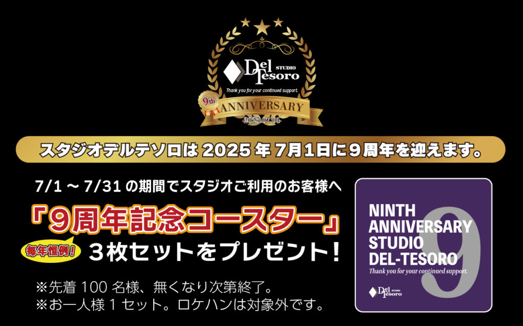 9周年記念プレゼント! 2025年6月27日 最終更新日時 : 2025年6月27日 del-tesoro-sub スタジオ デルテソロは、2025年7月1日で9周年! 7月にスタジオをご利用されたお客様へ「9周年記念コースター(3枚セット)」をプレゼント致します。 ※先着100名様。※お一人様1セット。※無くなり次第終了。※ロケハンは対象外です。
