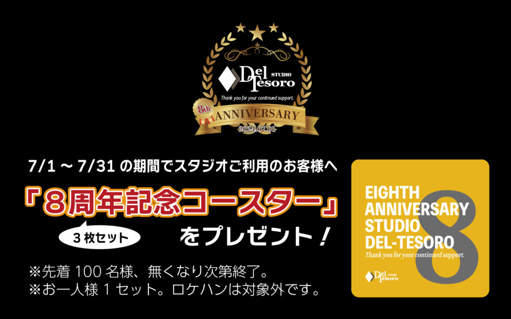 8周年記念プレゼント! 2024年6月24日 最終更新日時 : 2024年7月11日 del-tesoro-sub スタジオ デルテソロは、2024年7月1日で8周年! 7月にスタジオをご利用されたお客様へ「8周年記念コースター(3枚セット)」をプレゼント致します。 ※先着100名様。※お一人様1セット。※無くなり次第終了。※ロケハンは対象外です。