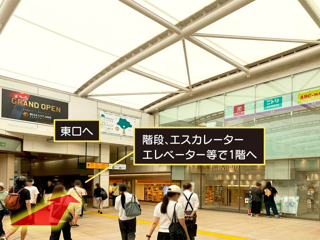 通路奥にある階段やエスカレーター等を使い1階の東口へ。