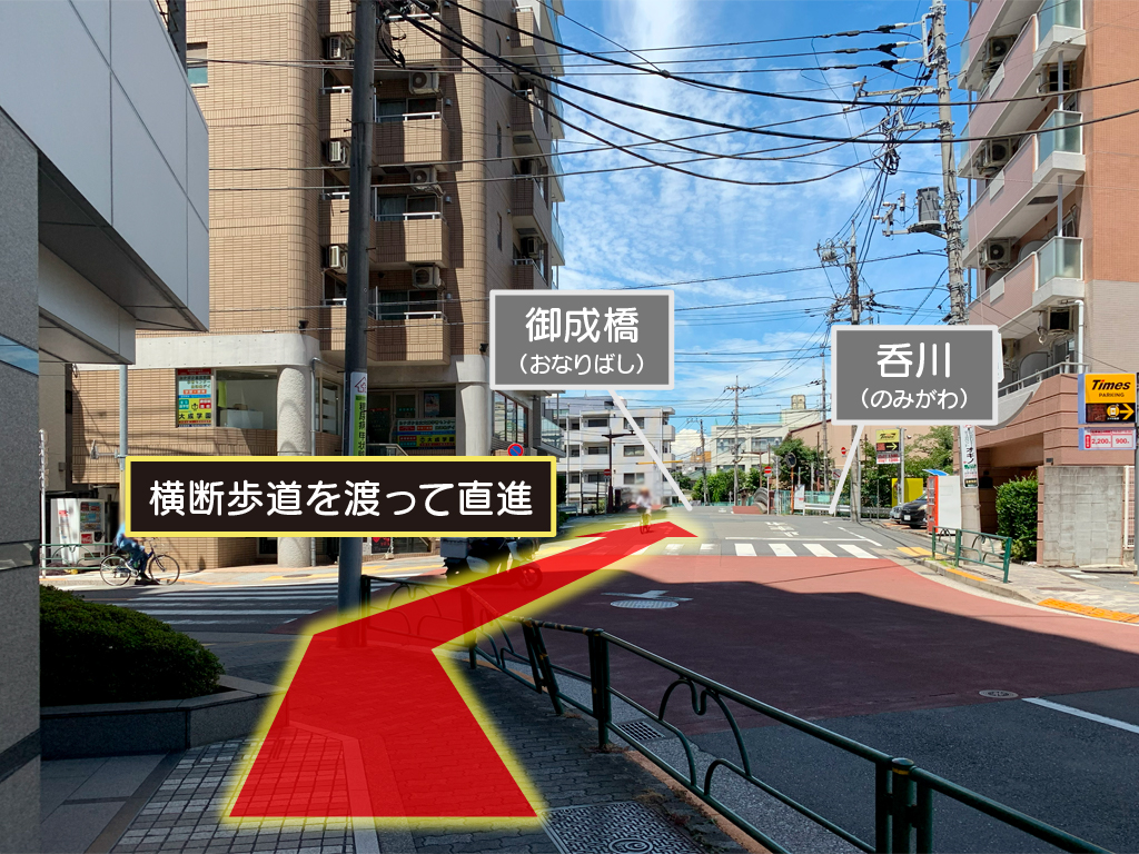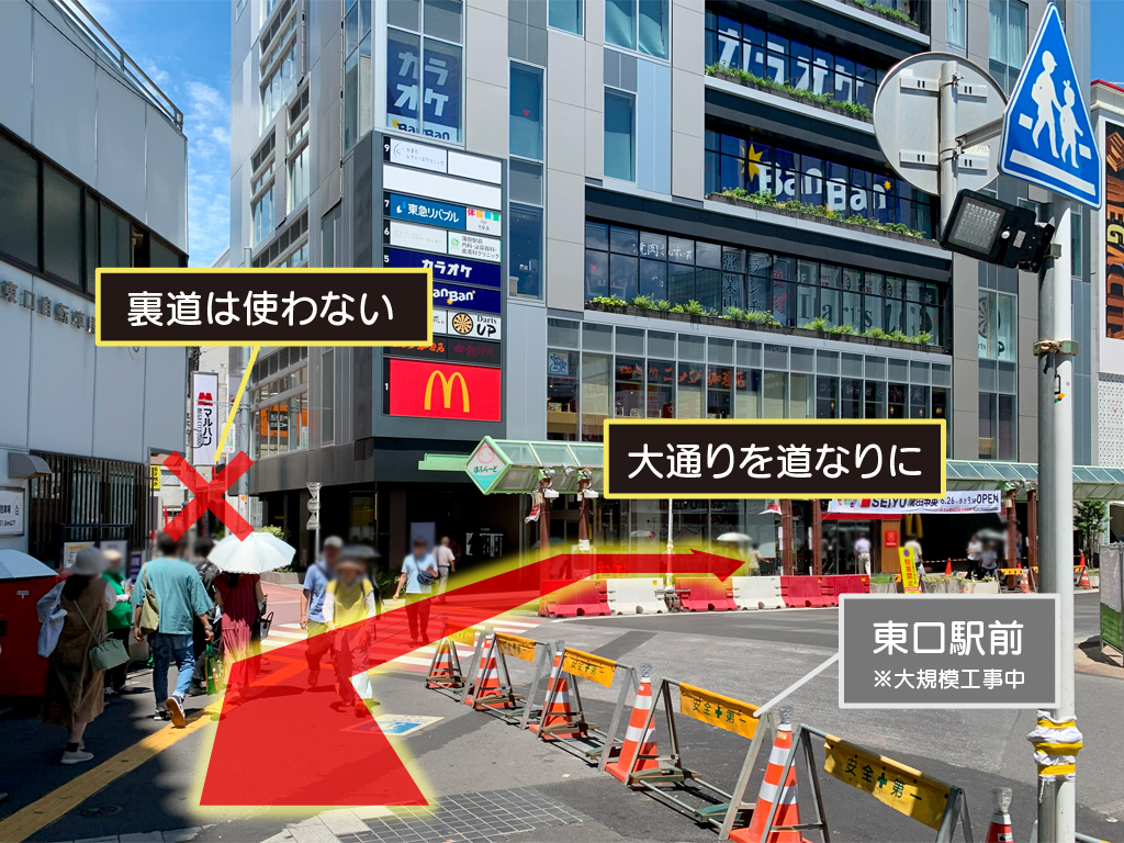 東口を出たら左折します。