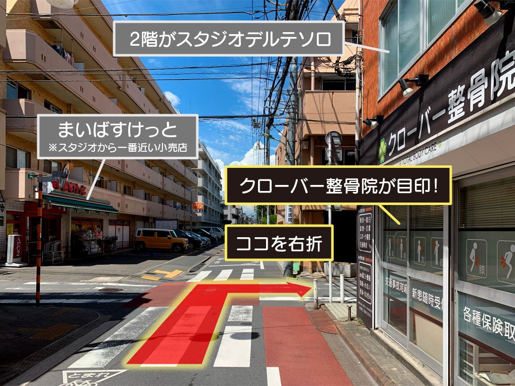 右手に「クローバー整骨院」がある交差点を右折します。
